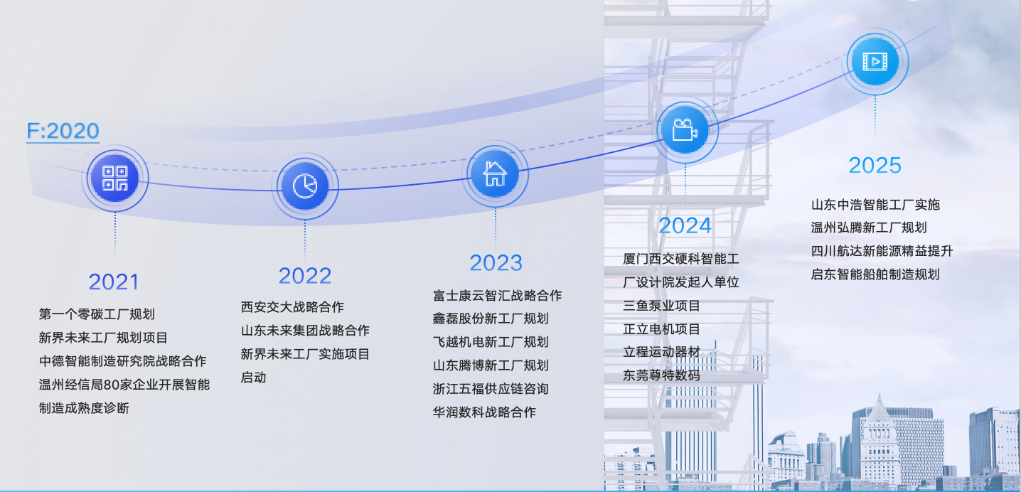 作为富士康孵化企业,我们与工业互联FII有紧密合作关系。同时我们也是数智汇(深圳)创始人单位之一,与山东未来集团、杭州迦智智能、华润数科形成战略合作。与西安交大管理学院、浙江中德智能制造研究院、工业4.0联盟等企业与机构深度合作; 2024年初参股成立厦门西交硬科智能工厂设计院有限公司。