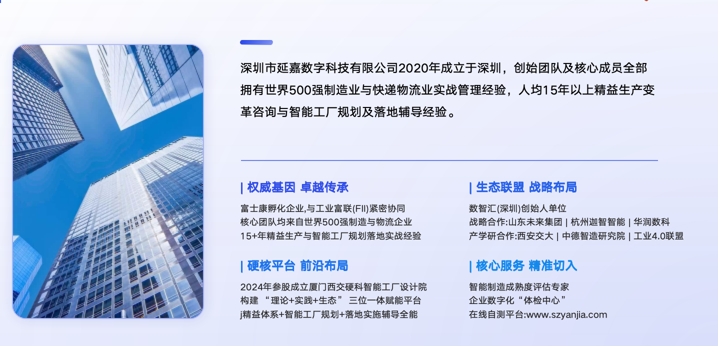 深圳市延嘉数字科技有限公司2020年成立于深圳,创始团队及核心成员全部拥有世界500强制造业与快递物流业实战管理经验,有15年以上精益生产变革咨询与智能工厂规划与落地辅导经验。 当前的中国要想从智能制造大国走向智能制造强国,应接受更多制造服务性支持,深圳延嘉为此而来。
